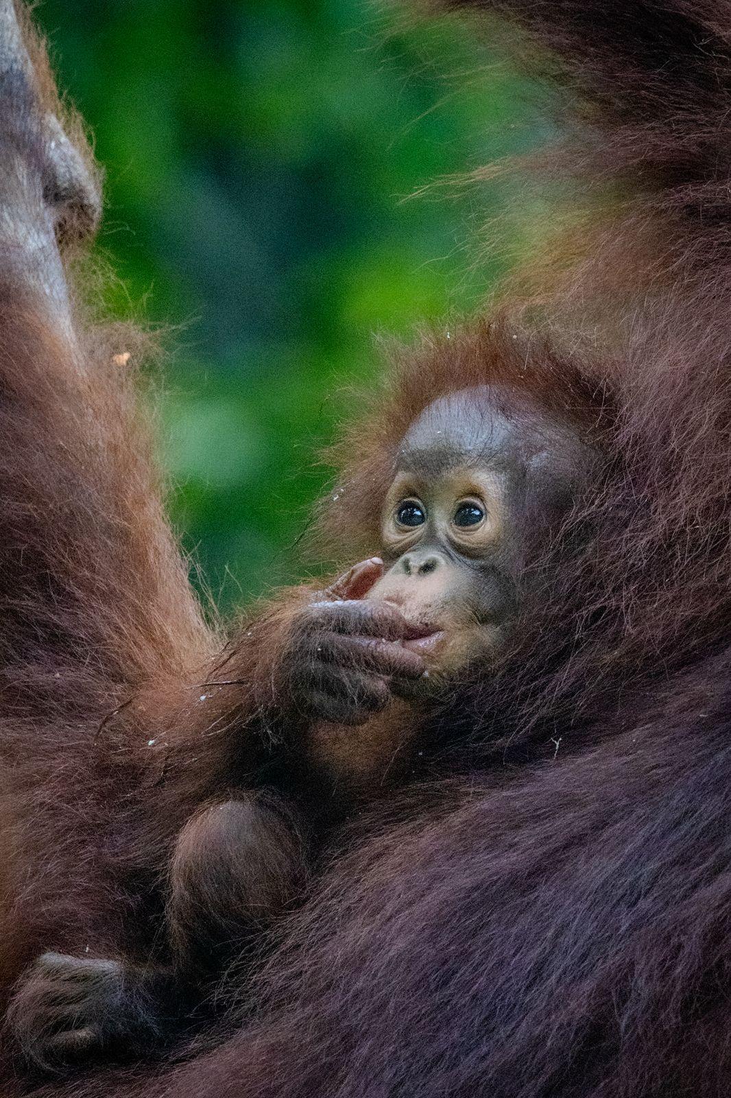 A baby orangutan nestled in its mother’s arms in the heart of the Borneo rainforest.
