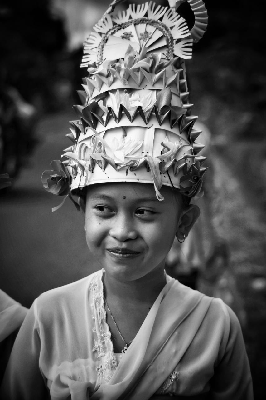 On this Kuningan morning a young girl carries her offering with quiet pride.