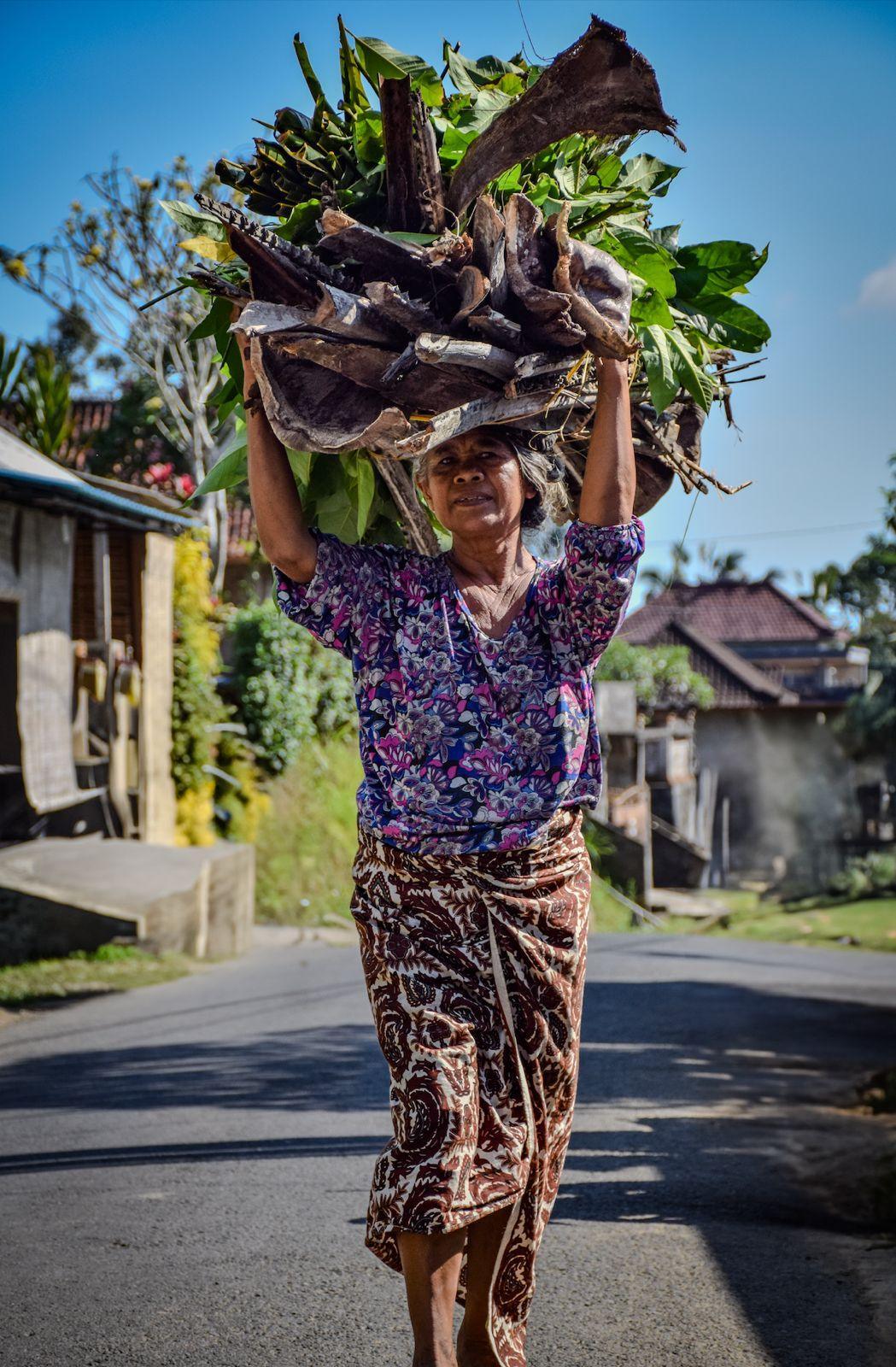 A person walks through a street in Ubud, carrying a bundle of foliage on their head. Captured in the moment, the scene reflects an everyday gesture at the heart of Bali.