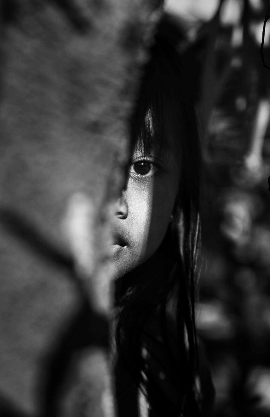 Black and white portrait of Cahaya partly hidden behind a tree. Her intense gaze emerges from the shadows.