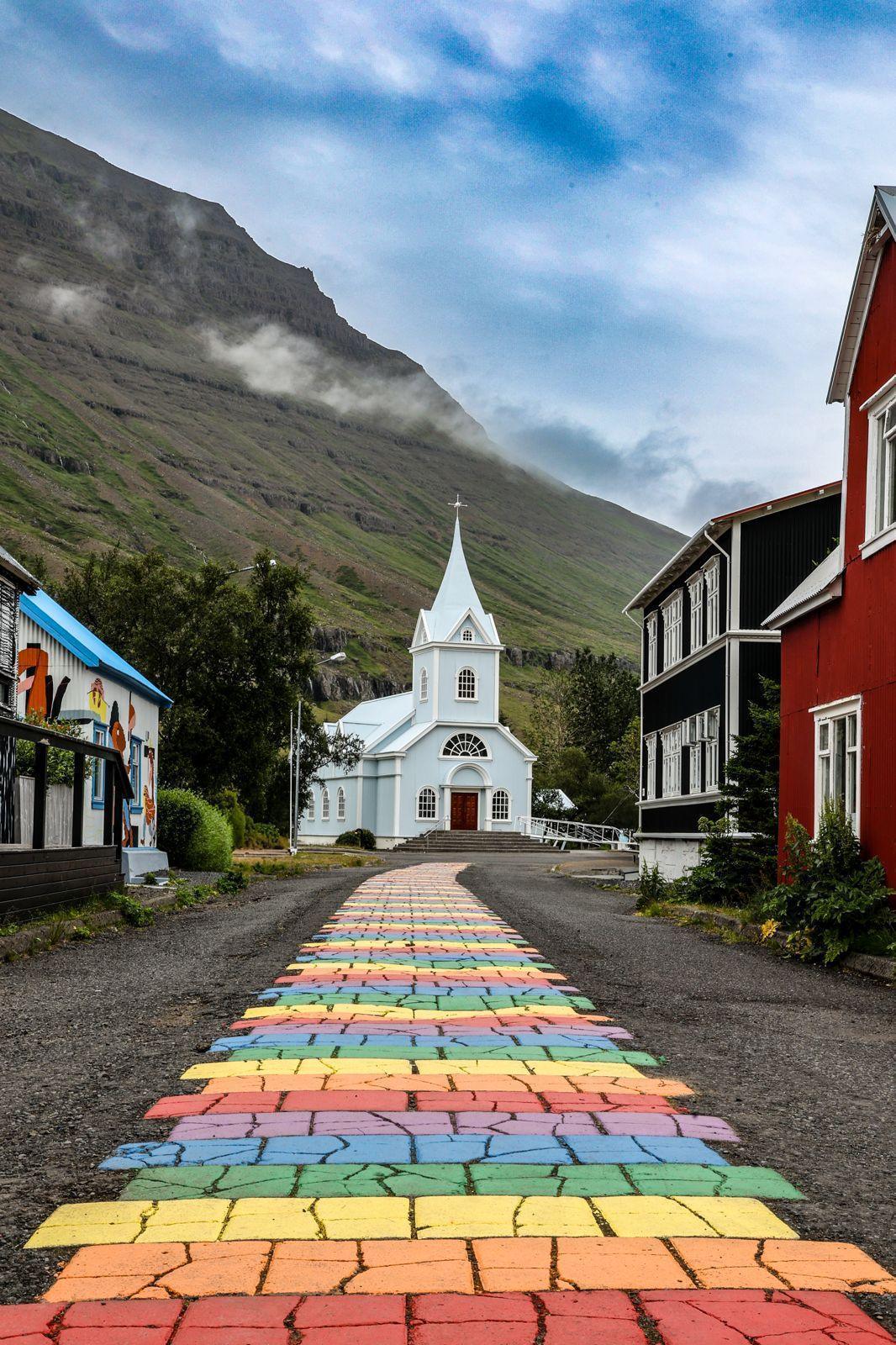 The blue church of Seyðisfjörður stands at the end of a colorful paved street. Set between mountains and the fjord, it reflects the quiet of this remote village in eastern Iceland.