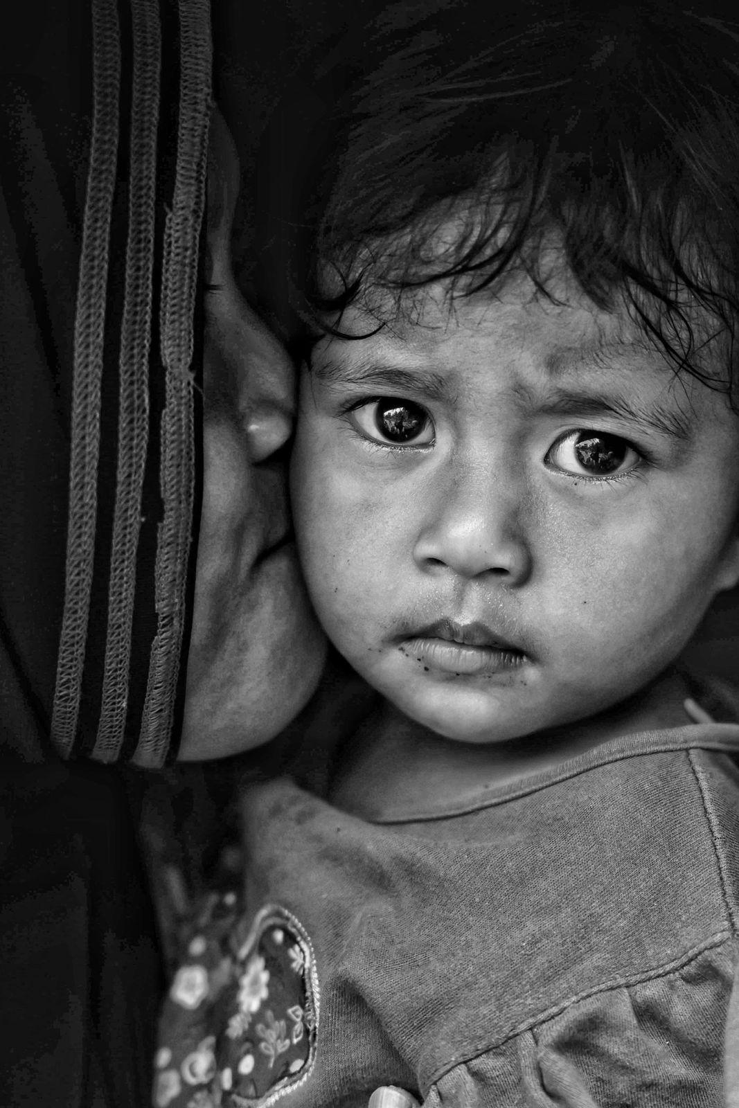 In West Java, a child looks into the camera with an intense gaze while his mother gently kisses him.