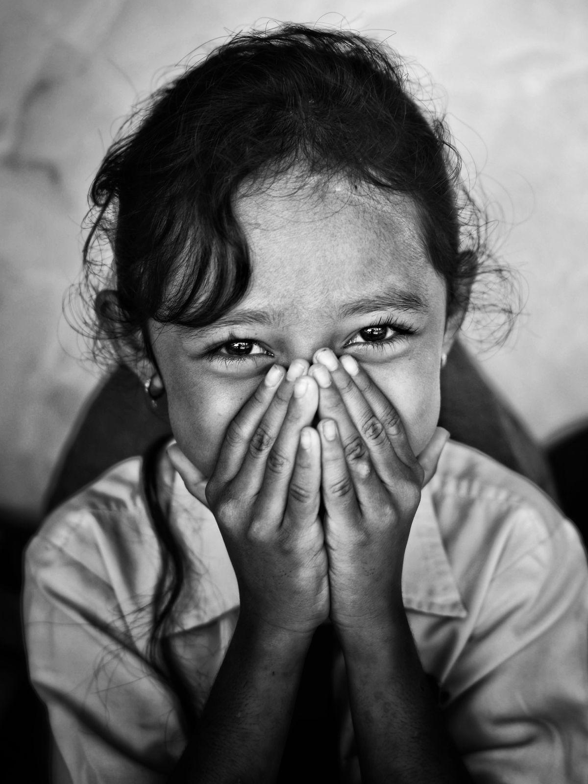A young girl in a village in Java tries to hide her laughter behind her hands. A simple, joyful moment.