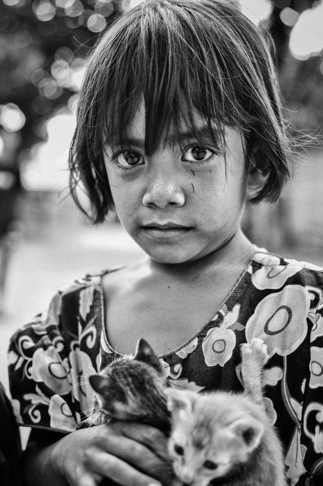 A young girl in western Java holds two small kittens in her hands. Her focused gaze and gentle gesture create a simple scene, filled with care and tenderness.