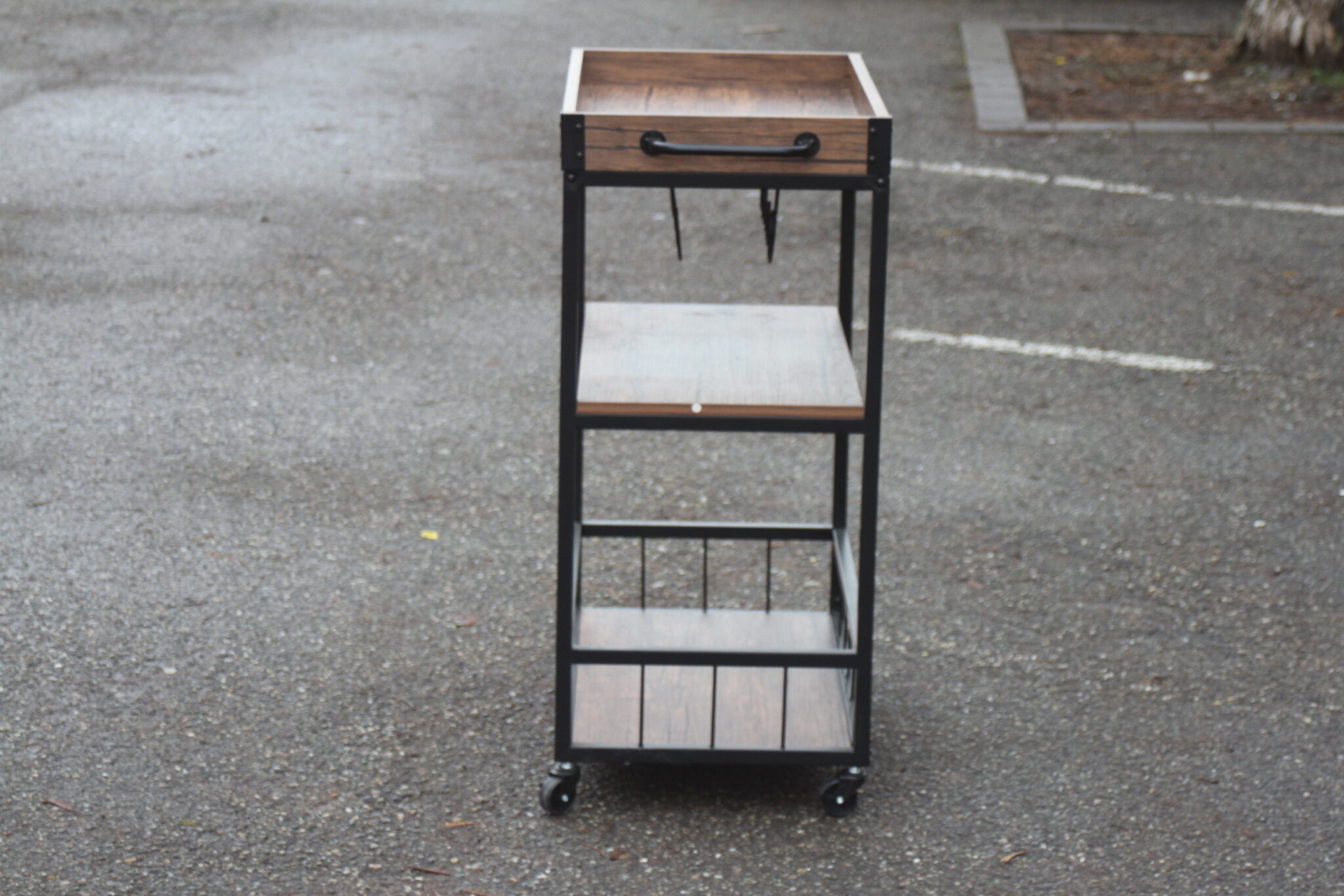 Desserte en métal noir et placage à 3 niveaux avec plateau amovible.
