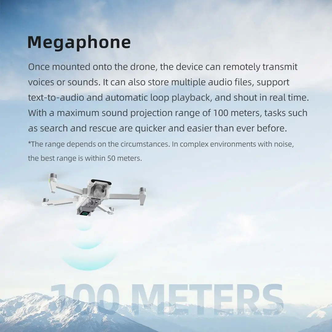 Une fois monté sur le drone, l’appareil peut transmettre à distance des voix ou des sons. Il peut également stocker plusieurs fichiers audio, prendre en charge la lecture texte-audio et automatique en boucle, et crier en temps réel. Avec une portée de projection sonore maximale de 100 mètres, les tâches telles que la recherche et le sauvetage sont plus rapides et plus faciles que jamais. * La portée dépend des circonstances. Dans les environnements complexes avec du bruit, la meilleure portée est à moins de 50 mètres.