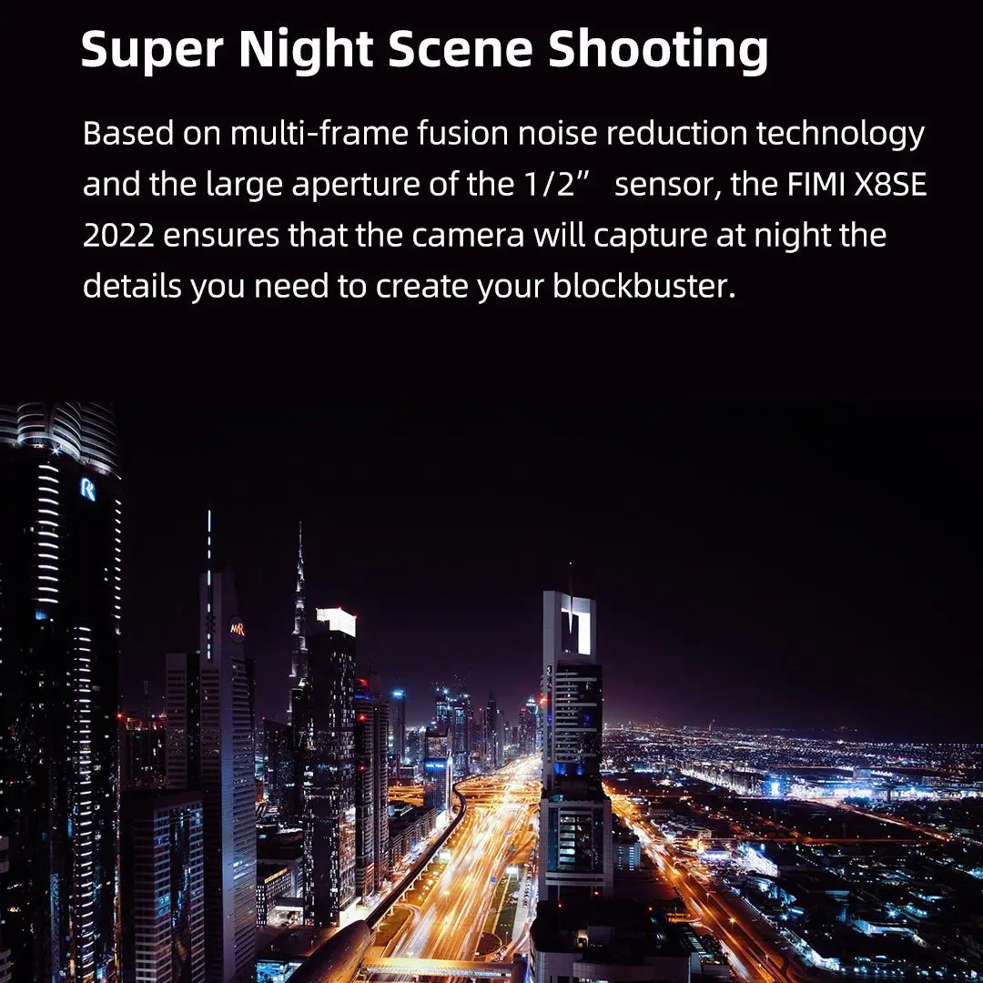 Basé sur la technologie de réduction de bruit fusion multi-images et la grande ouverture du capteur 1/2 “, le FIMI X8SE 2022 garantit que l’appareil photo captera la nuit les détails dont vous avez besoin pour créer votre blockbuster.