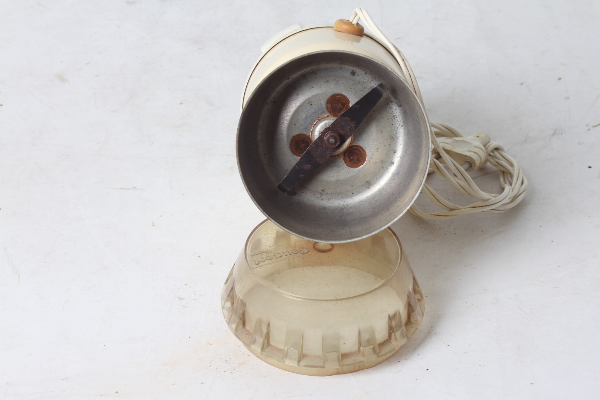 Moulin à café en métal couleur crème avec couvercle en plastique.