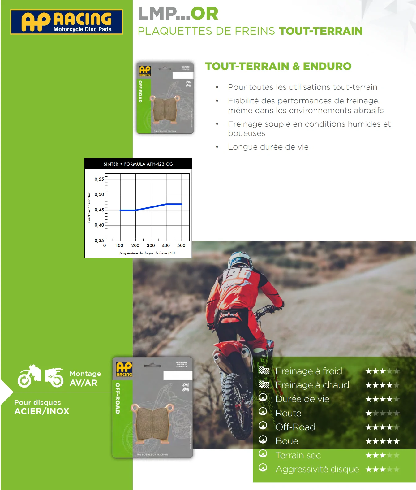• Pour toutes les utilisations en tout-terrain et enduro et pour la route pour moins de pollutions ! Freinage souple en conditions humides et boueuses